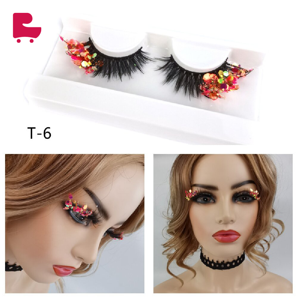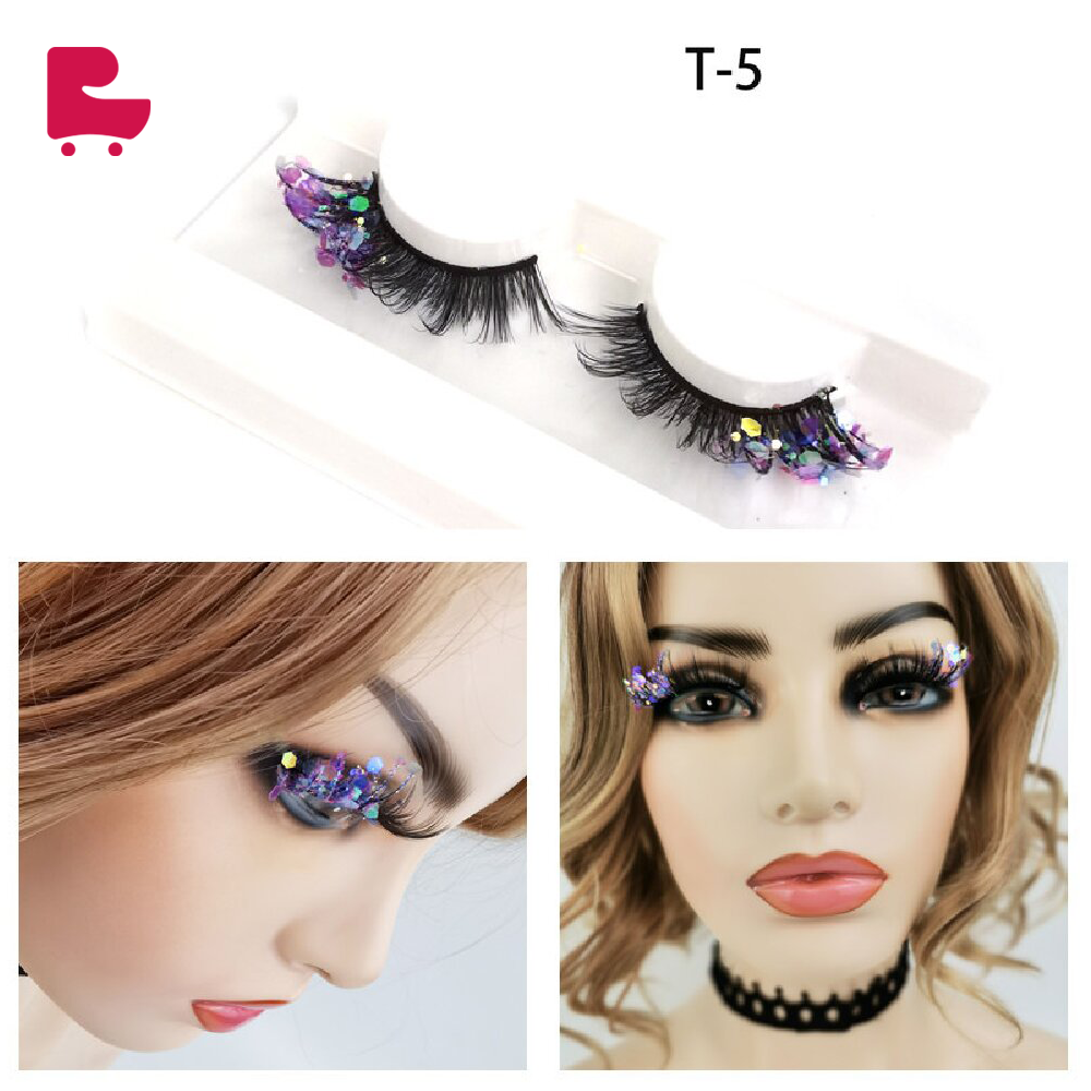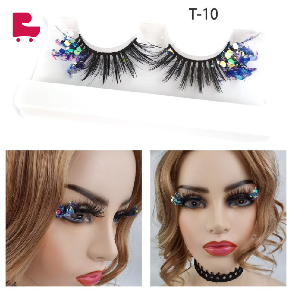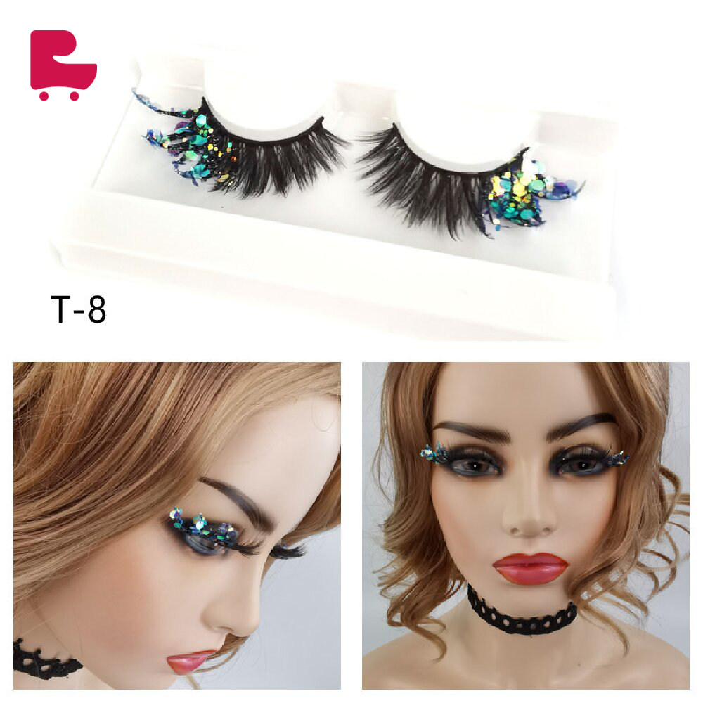 The glittery eyelashes are made by handcrafting eyelashes with glitter, with a unique and bold style, creating a distinctive visual effect that makes you stand out in the crowd. Despite the bold appearance, these eyelashes are lightweight and comfortable to wear. The elastic band is easy to stick and firmly adhere, ensuring that your eyelashes stay in place without causing any discomfort or irritation.
