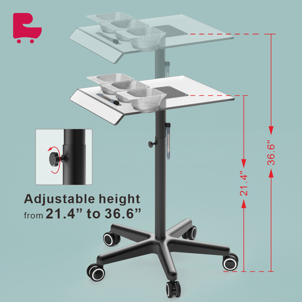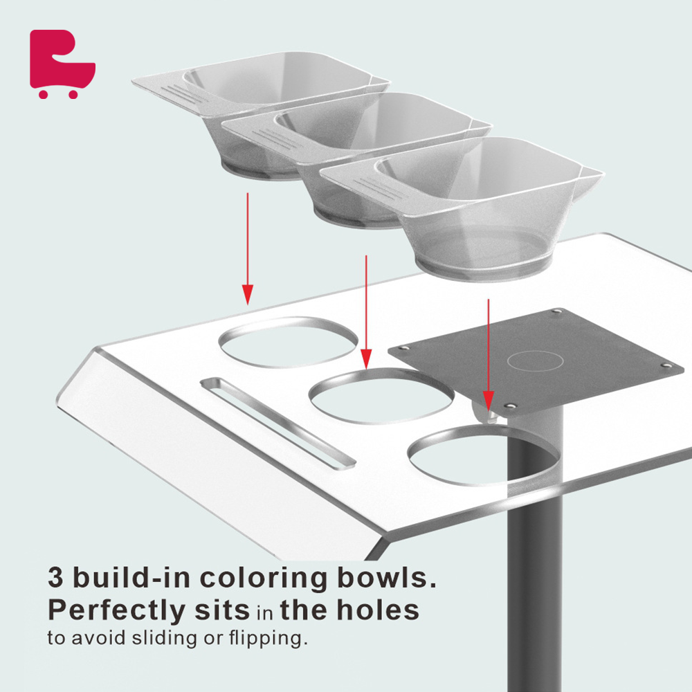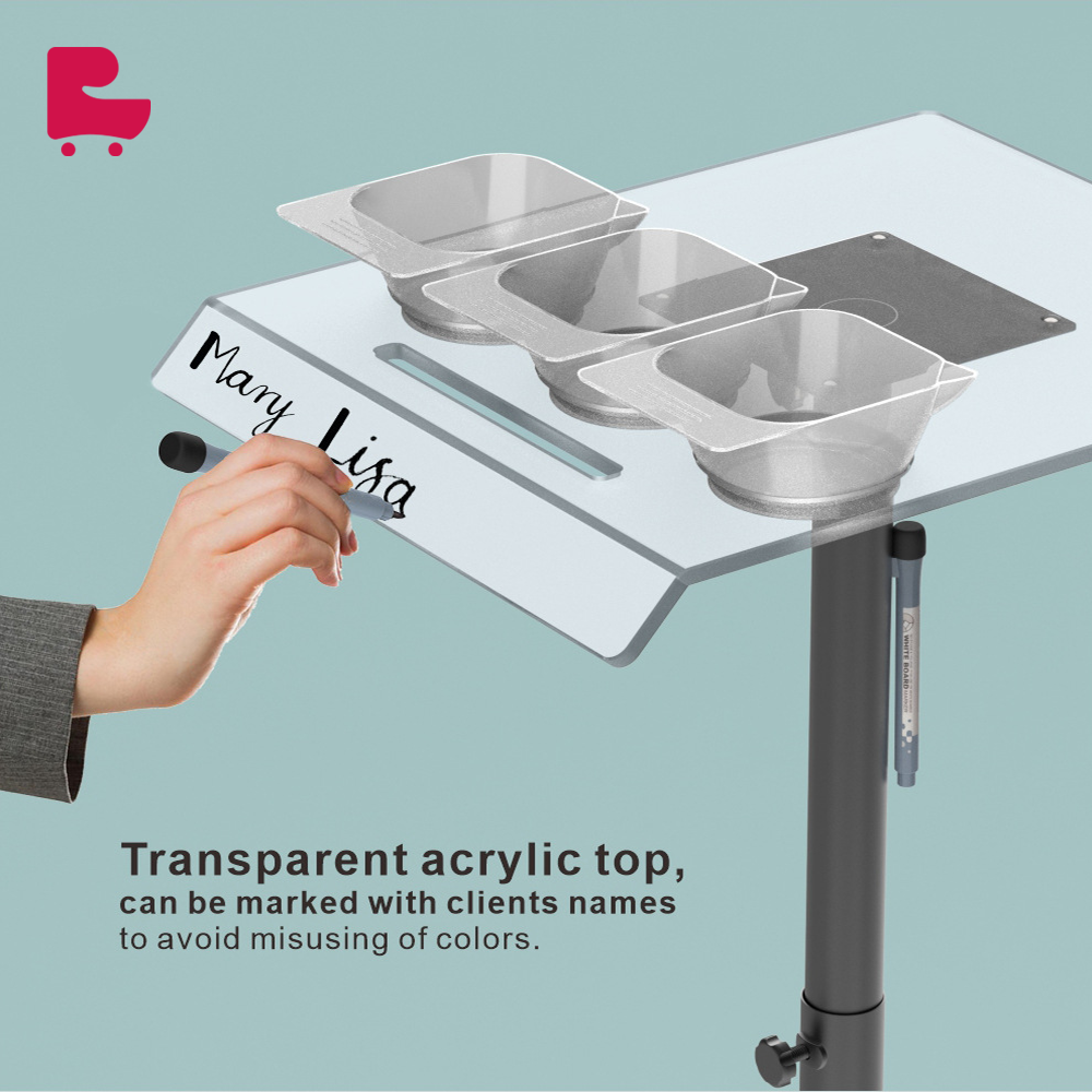 Transparent acrylic desktop: Made of high transparency and wear-resistant acrylic material, not only making the workbench look more fashionable and high-end, but also allowing you to sign and make notes, which is convenient for use during dyeing. Black metal frame: The sturdy and durable black metal frame provides stable support for the workbench. Its design is simple but not lacking in fashion sense, complementing the transparent acrylic desktop. Four-wheel mobile design: The workbench is equipped with four flexible wheels at the bottom, allowing you to easily move the workbench to the desired position. Whether it is a narrow corridor or a spacious laboratory, it can be easily dealt with. White plastic container: The desktop is equipped with two white plastic dye bowls for storing liquid samples or dye. The container is made of high-quality plastic material, with acid and alkali resistance, heat resistance and other characteristics.