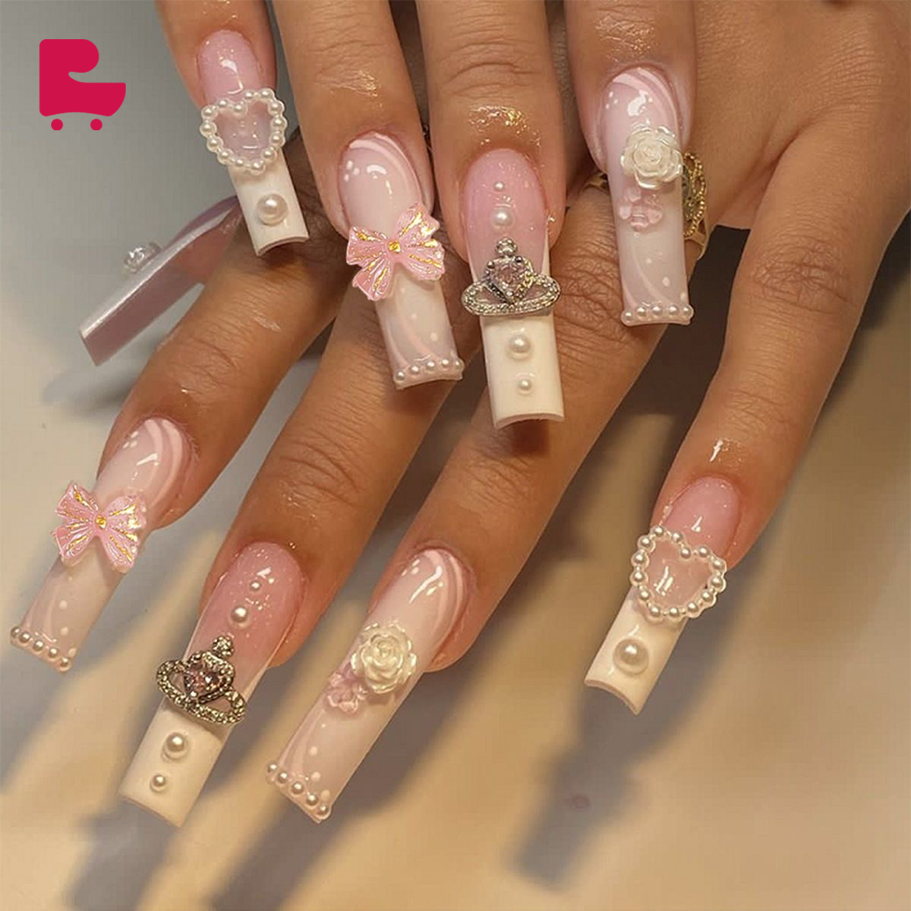Luxury accessories: Each nail is decorated with elaborate accessories, including pink flowers, gold crowns and white pearls. These accessories are not only beautiful, but also blend perfectly with the color of the nail polish, showing a luxurious and sophisticated aesthetic.