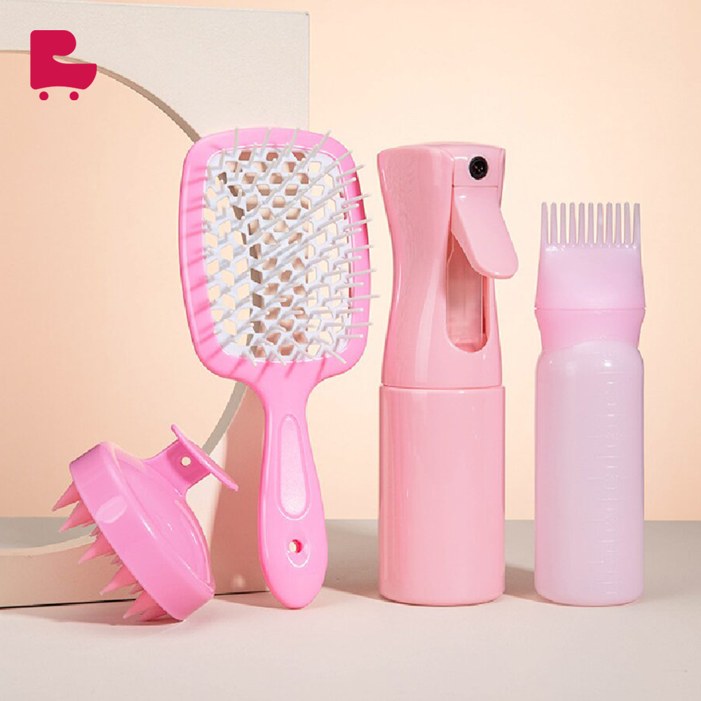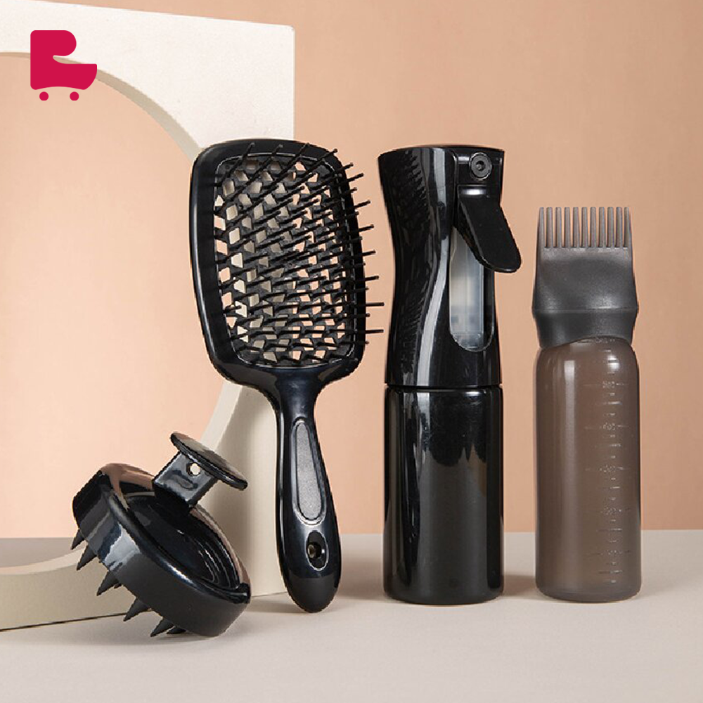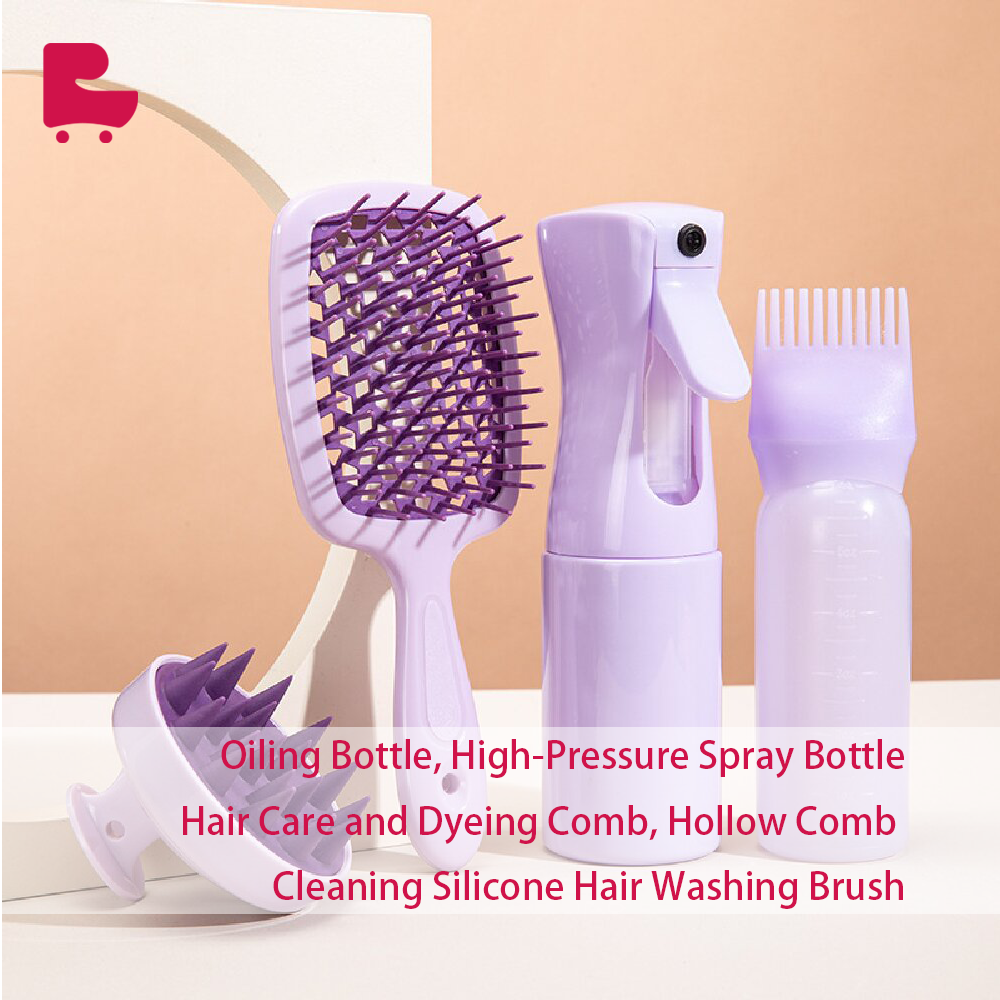 Oiling Bottle, High-Pressure Spray Bottle, Cleaning Silicone Hair Washing Brush, Hollow Comb, Hair Care and Hair Dyeing Comb Set. High-pressure spray bottle with 200ml capacity, silicone hair washing brush with soft and elastic bristles, hollow comb with close and even tooth arrangement, and hair care dyeing comb with smooth and round comb teeth.