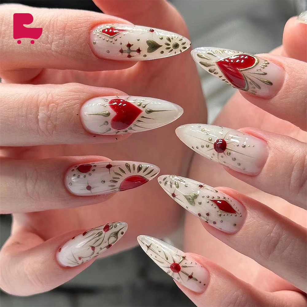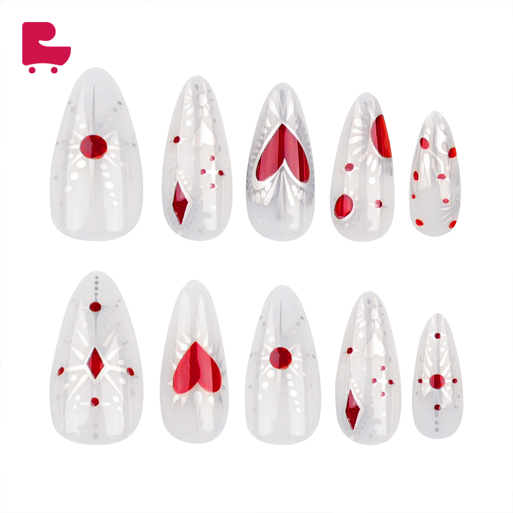 Colorful patterns: Each nail is decorated with different designs, including hearts in red, gems in red, lines and dots in silver, etc. These designs are complex and sophisticated, and can reflect your personality and taste.