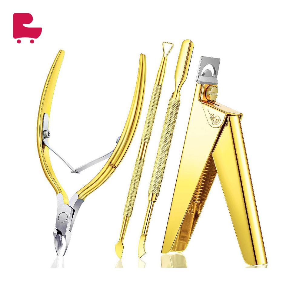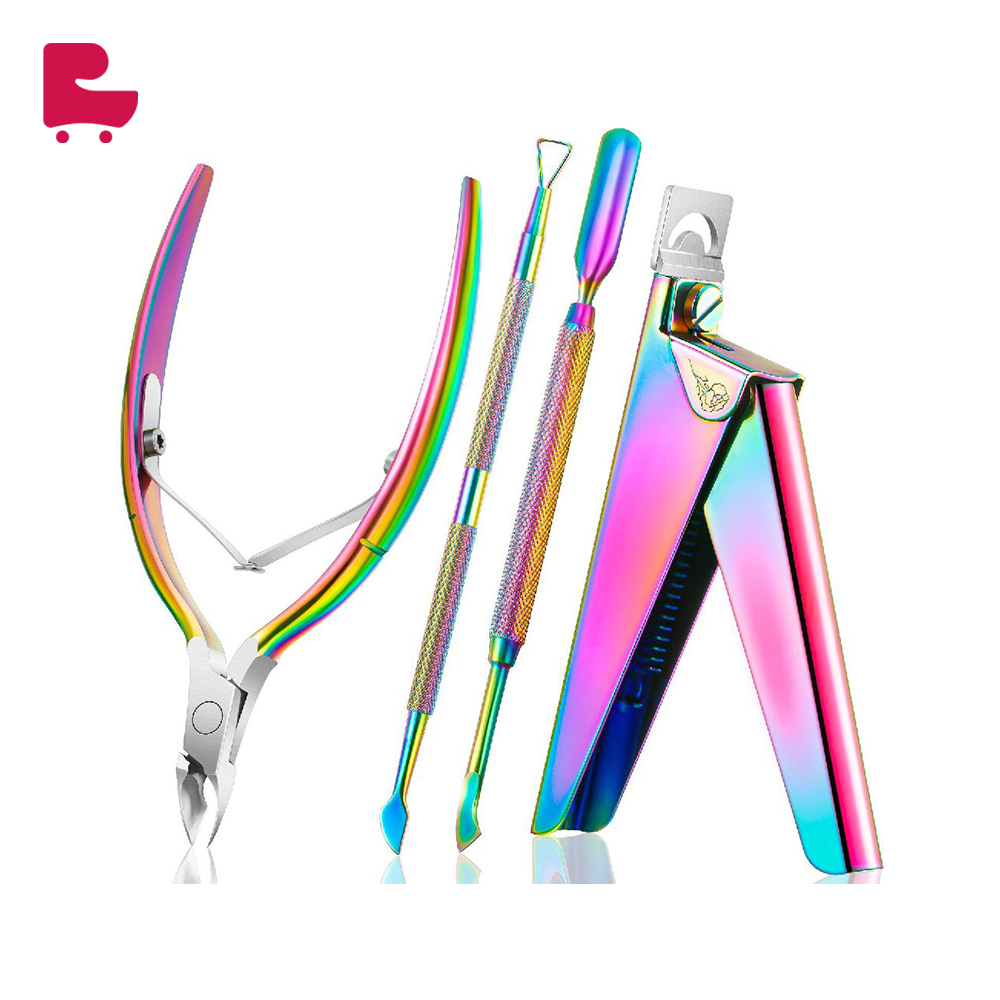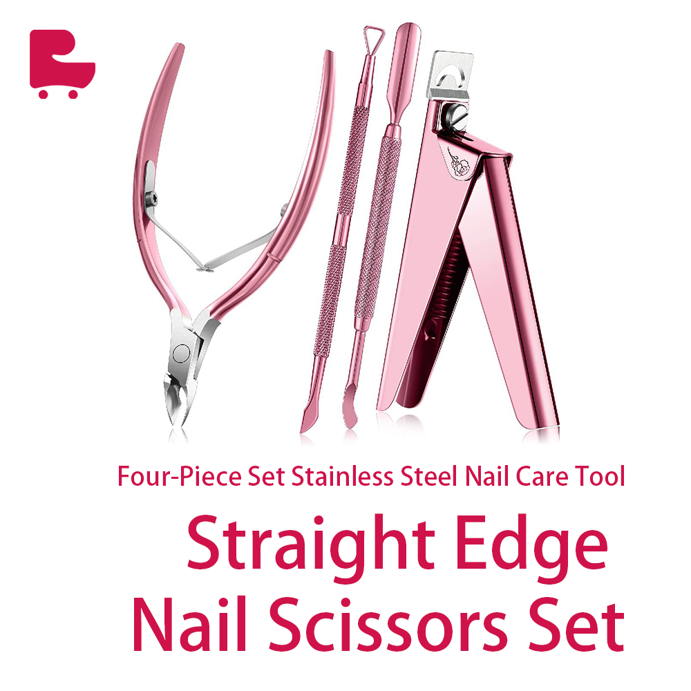 Stainless Steel Nail Care Tool Upright Nail Art One-Word Scissors Combination Four-Piece Set. Made of high-quality stainless steel, coated for durability and aesthetics. Upright design for stability, includes one-word scissors, double-head large slant pusher, double-head nail remover, and cuticle scissors.